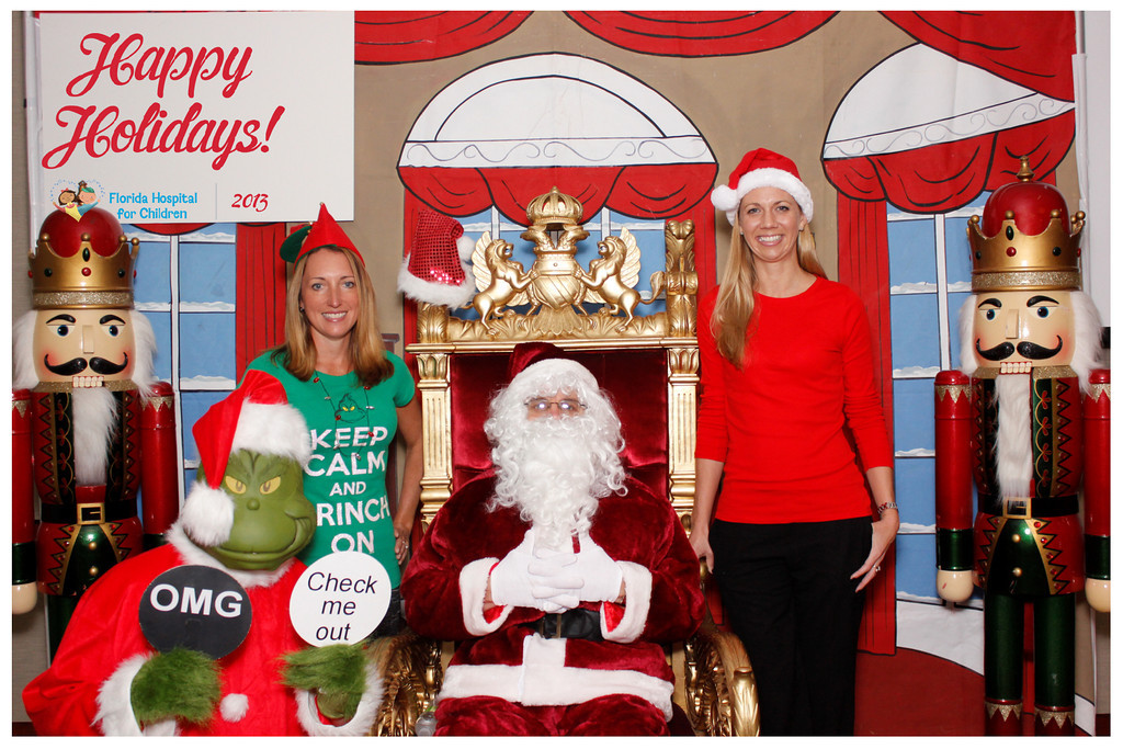 RECAP – The Florida Hospital for Children had their annual holiday party for all of their employees. The festivities took place in the Creation Room where employees were greeted with a warm hello and a goody box. Heavy hor’dourves were served alongside hot apple cider and hot chocolate. Employees and their families were able to relax and enjoy the a cookie making station, play Nintendo Wii, listen on Christmas Carolers and of course take pictures with us and Santa! We had 2 backgrounds set up; the first was with Santa himself and the Grinch and the second was our onyx background.