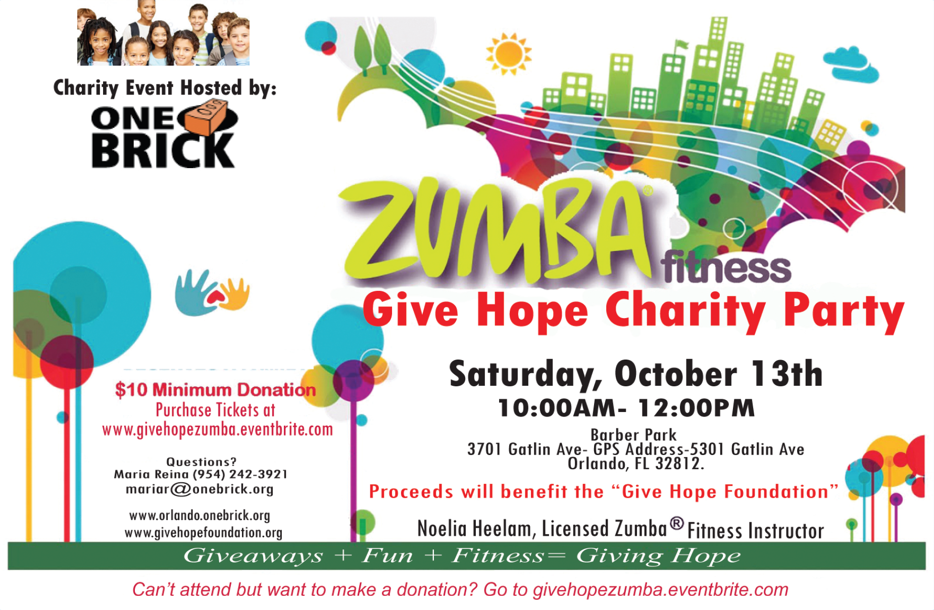 WHAT – ZUMBA Fitness – Give Hope Charity Party hosted by One Brick; Proceeds will benefit the “Give Hope Foundation”